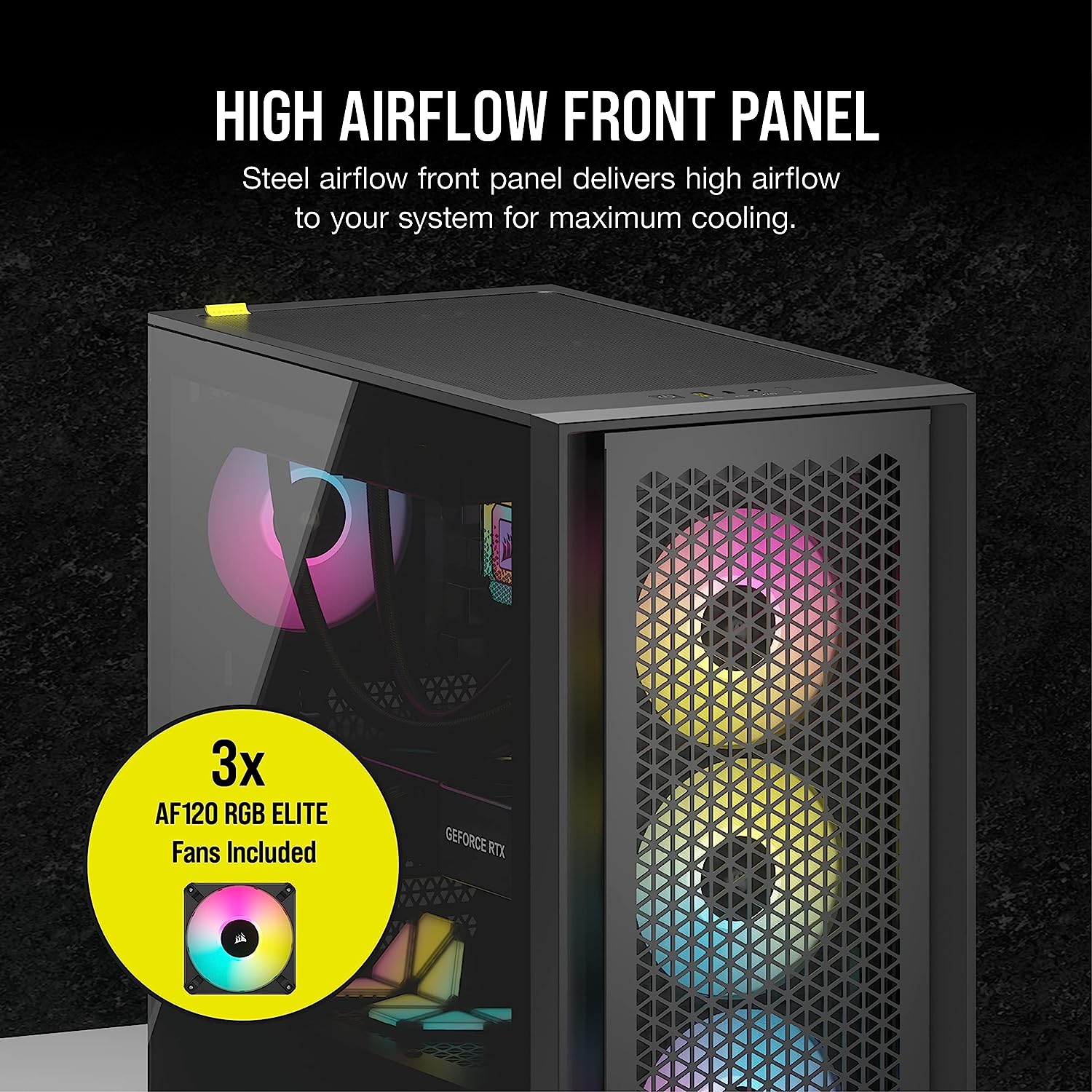 A high-airflow front panel ensures maximum air intake, while three included AF120 RGB ELITE PWM fans with AirGuide technology focus it towards your components at fan speeds up to 2,100 RPM.