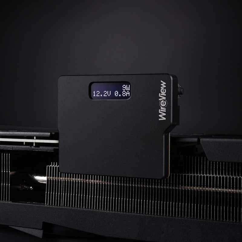 The WireView GPU is a device for measuring the power consumption of graphics cards that was developed in collaboration with Jon "elmor" Sandström It is plugged into the PCIe power connectors of the graphics card and connected to the power supply unit via the PCIe power cables. The power consumption data is displayed via an OLED display.